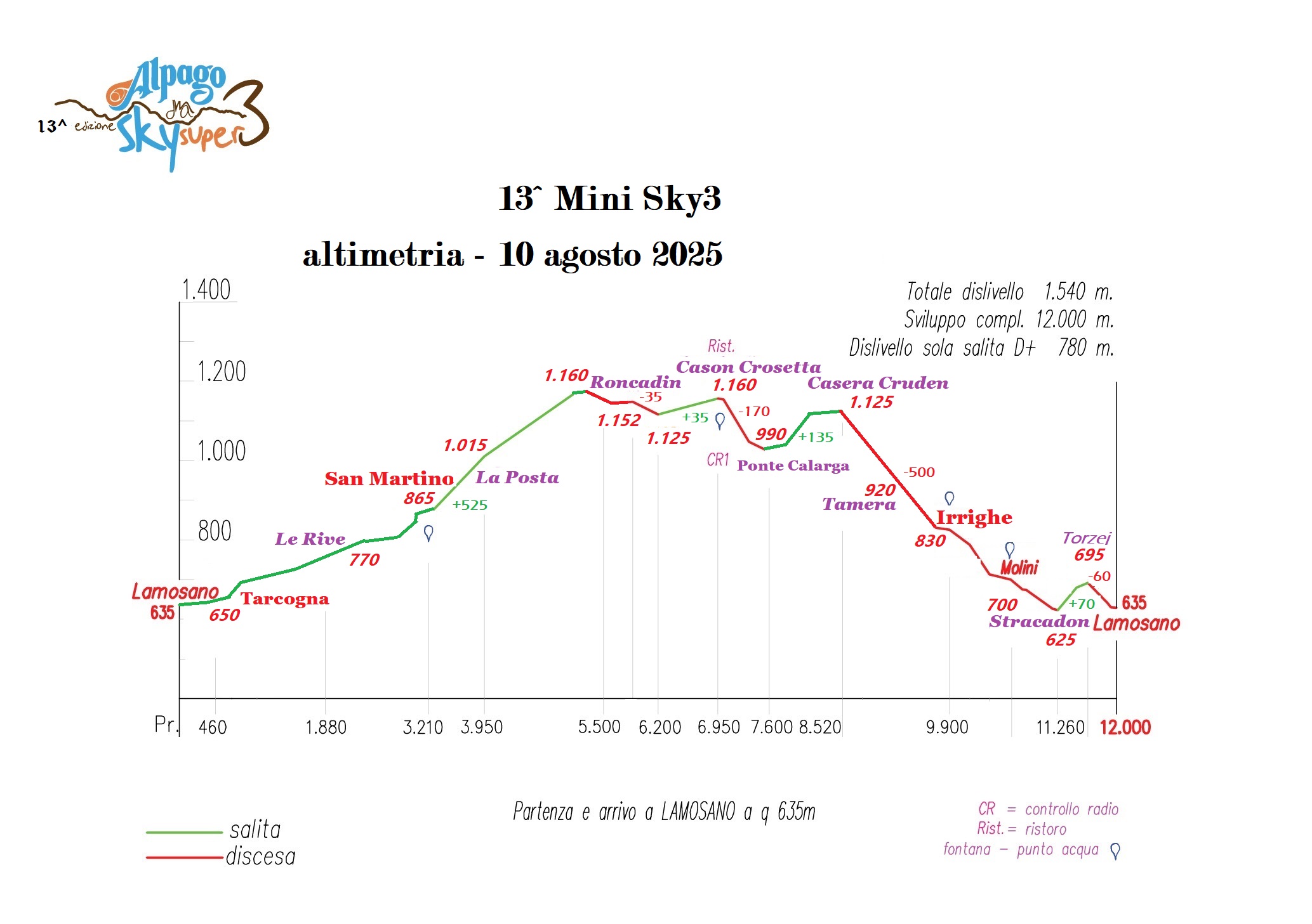 ALTIMETRIA - 13^ MiniSky3 di km. 12 con dislivello positivo di 780 mt. - Partenza alle ore 17,30 a Lamosano dove è posto pure l’arrivo.