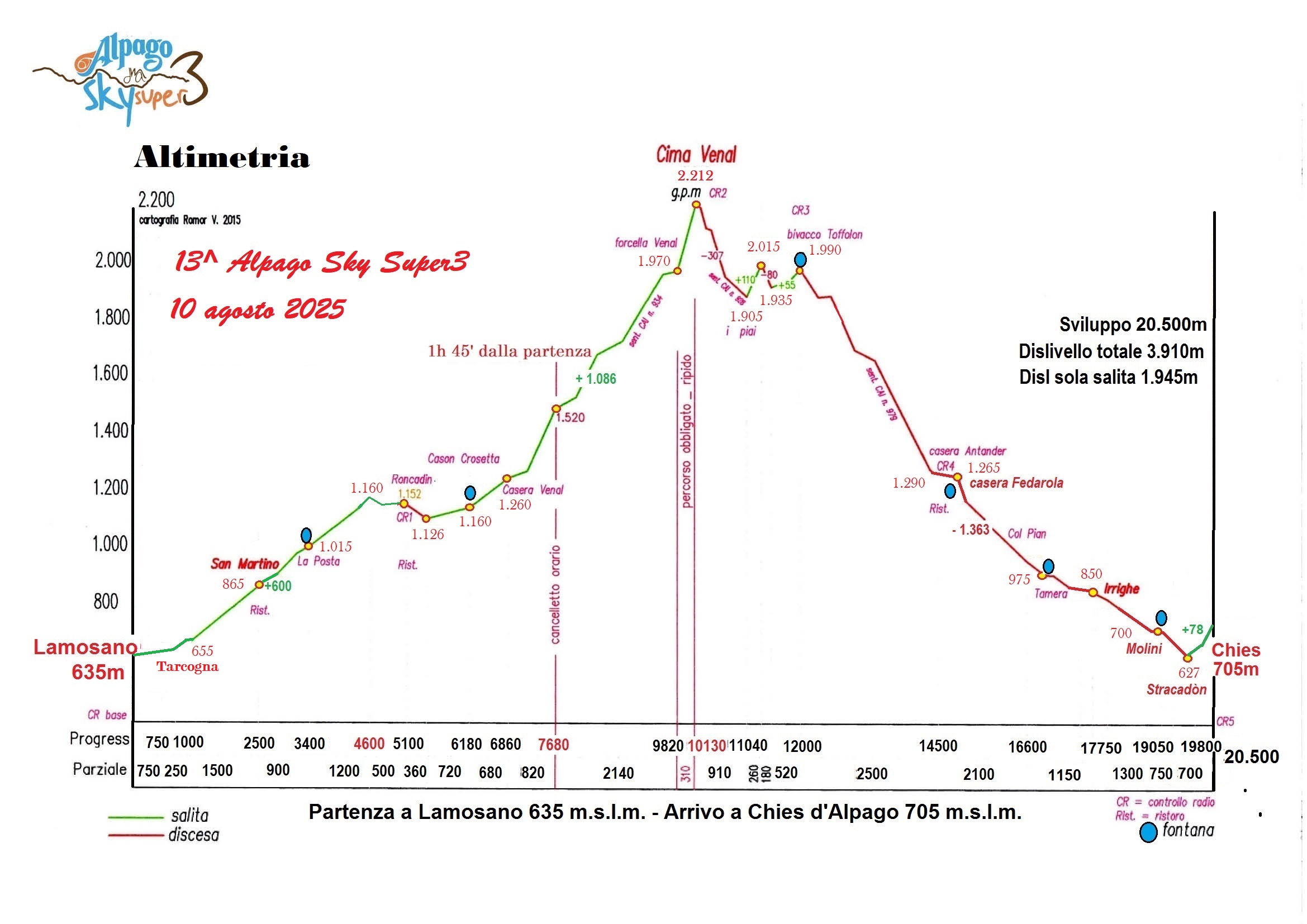 - 13^ SKY3 con tracciato di km 20,3 e con dislivello positivo di 1.920 mt. - Partenza a Lamosano alle ore 08,30 e arrivo a Chies d’Alpago in piazzetta Belvedere.